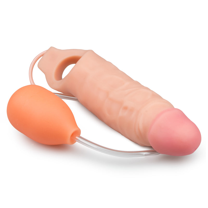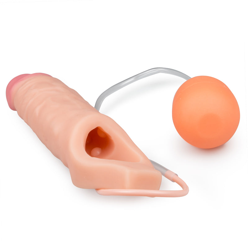 Seien Sie bereit für die ultimative und realistische Sofort-Penisvergrößerung mit dieser spritzenden, ejakulierenden Penishülle! Sie gibt Ihnen nicht nur sofort extra Länge und Umfang mit einem realistischen Aussehen und Gefühl; wenn Sie die Handpumpe drücken, können Sie außerdem eine Ladung in oder auf Ihren Partner schießen, für einen explosiven Höhepunkt. Füllen Sie die Pumpe mit jeder Flüssigkeit, die Sie wollen. Sie kann bis zu 60 ml aufnehmen, also können Sie Ladung um Ladung verbrauchen, bis Sie vollkommen erschöpft sind. Das biegsame Gummi ist elastisch genug, um den meisten Größen gerecht zu werden, wobei es straff genug bleibt für ernstes Eindringen. Der geäderte Schaft bietet eine aufregende Struktur und der glatte, rosa Kopf vom Schwanz trägt zu einem lebensechten Aussehen bei. Das Innere ist mit großen Texturknoten versehen für mehr Gefühl, Enge und Halt. Jetzt können Sie Ihre Fülle an lebensechter Penetration mit einem orgasmischen Höhepunkt erleben, mit dieser ejakulierenden Penishülle!