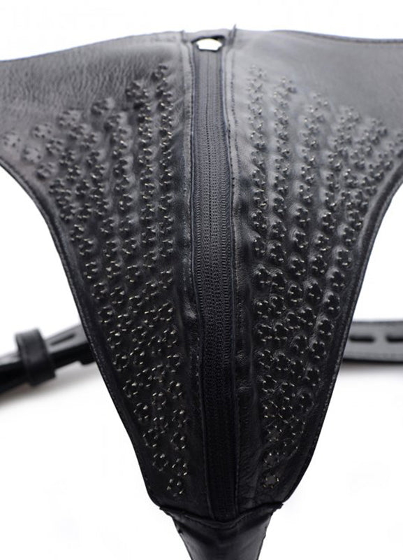 Dieses Lederkeuschheitssuspensorium ist die perfekte Wahl, wenn Sie Ihre finstersten Fantasien Wirklichkeit werden lassen. Das schwarze Suspensorium hat einen harten Look und hat innenliegend Dutzende kleiner, scharfe Dornen, die die Haut auf und um Ihren Penis und Hoden eindringen. Erleben Sie selbst das Kribbeln selbst oder bestellen Sie Ihren Sub, um dieses Suspensorium zu tragen. Es hat verstellbare Riemen und einen Reißverschluss, der mit einem Vorhängeschloss verriegelt werden kann. Das macht es unmöglich, das Suspensorium ohne Schlüssel auszuziehen.