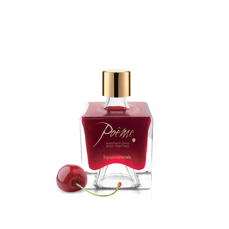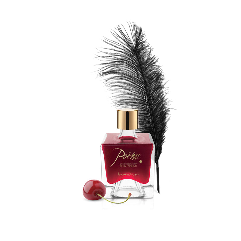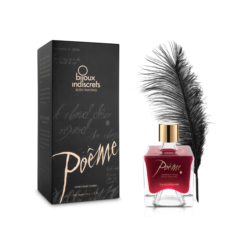 Mit diesem einzigartigen Poeme Sweetheart Cherry Set können Sie den Geschmack und Duft von Kirschen auf eine andere Weise genießen! Das Set besteht aus einer küssbaren Körperfarbe und einem Federstift mit Silikonspitze. Mit dem Federstift können Sie sexy Worte auf den Körper des anderen schreiben, und danach können Sie den lieblichen Kirschgeschmack genießen, wenn Sie die Wörter von den Körpern des anderen lecken.